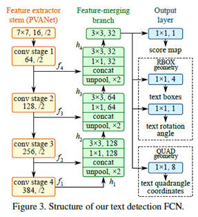 场景文字检测来自2017年旷视科技提出的EAST场景文字检测模型,相关的模型结构如下: