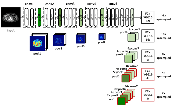 其中FCN主要是基于VGG16~VGG19作为基础网络,速度很慢,该网络是在2015年时候提出,是早期很典型的图像语义分割网络,不是一个对称的卷积反卷积分割网络,在编码阶段网络过长,解码网络很少,结果堪忧!网络结构如下: