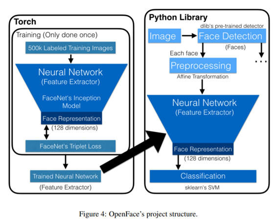 人脸识别来自OpenFace,OpenFace是一种典型的移动端实时的人脸识别模型,跟它相似的还有LightCNN模型。OpenFace是基于facenet的Inception网络作为backbone网络训练生存的torch网络模型,然后基于SVM实现了分类推理,完整的OpenFace项目结构如下: