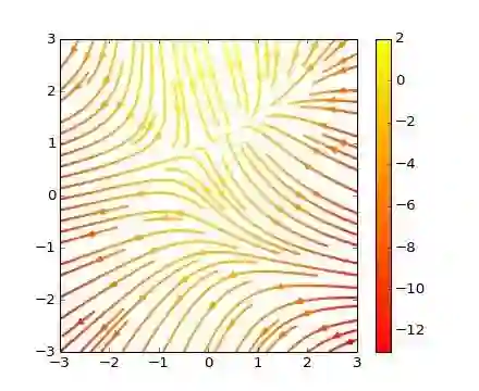 plt.streamplot(X, Y, U, V, color=U, linewidth=2, cmap=plt.cm.autumn)plt.colorbar()