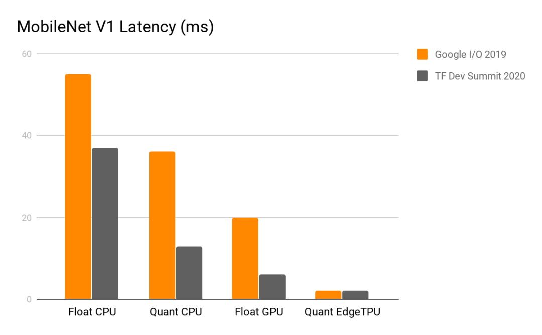 此外,我们也将继续改进了现有已支持平台的性能,如下图所示,我们对比了 2019 年 5 月和 2020 年 2 月的性能。只需升级到最新版 TensorFlow Lite 库,您便可享受这些改进所带来的好处。
