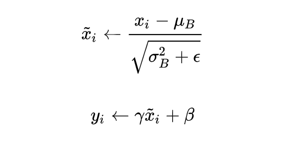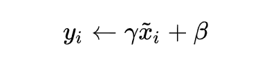 然而实现起来并不是那么简单的。如果仅仅使用上面的归一化公式,对网络某一层 A 的输出数据做归一化,然后送入网络下一层 B,这样是会影响到本层网络 A 所学习到的特征的。打个比方,比如我网络中间某一层学习到特征数据本身就分布在 S 型激活函数的两侧,你强制把它给我归一化处理、标准差也限制在了 1,把数据变换成分布于 s 函数的中间部分,这样就相当于我这一层网络所学习到的特征分布被你搞坏了,这可怎么办?于是文献使出了一招惊天地泣鬼神的招式:变换重构,引入了可学习参数 γ、β,这就是算法关键之处: