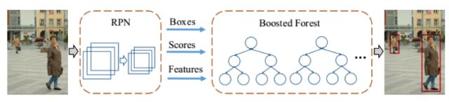 文献[16]分析了Faster R-CNN在行人检测问题上的表现,结果表明,直接使用这种算法进行行人检测效果并不满意。作者发现,Faster R-CNN中的RPN网络对提取行人候选区域是相当有效的,而下游的检测网络表现的不好。作者指出了其中的两个原因:对于小目标,卷积层给出的特征图像太小了,无法有效的描述目标;另外,也缺乏难分的负样本挖掘机制。作者在这里采用了一种混合的策略,用RPN提取出候选区域,然后用随机森林对候选区域进行分类。这一结构如下图所示:
