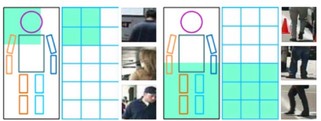 文献[21]提出了一种基于部件的检测方案,称为DeepParts,致力于解决遮挡问题。这种方案将人体划分成多个部位,分别进行检测,然后将结果组合起来。部位划分方案如下图所示: