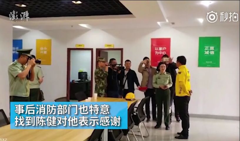2018年5月,江苏扬州一居民楼发生火灾,正好被送餐途中的外卖小哥陈健发现。他迅速砸破着火房屋窗户,方便消防栓冲水,其后又拎着灭火器冲入火场灭火。小哥表示,自己是一名退役武警,这么做是出于军人本性。
