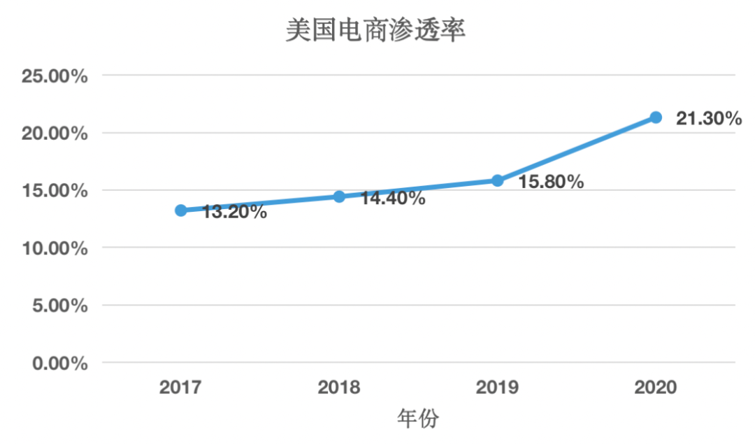 此前的2017年至2019年,美国电商渗透率都在10-15%左右,疫情爆发后,用户线上购物的习惯正在养成,电商渗透率也随之提升到21.3%。