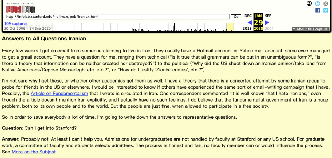 怎么回事?质疑者表示,Jeff Ullman 有着严重的种族主义倾向。他曾在个人主页中公开回复过自己关于伊朗的一些问题,同时「阻止伊朗学生前往斯坦福大学攻读研究生」。