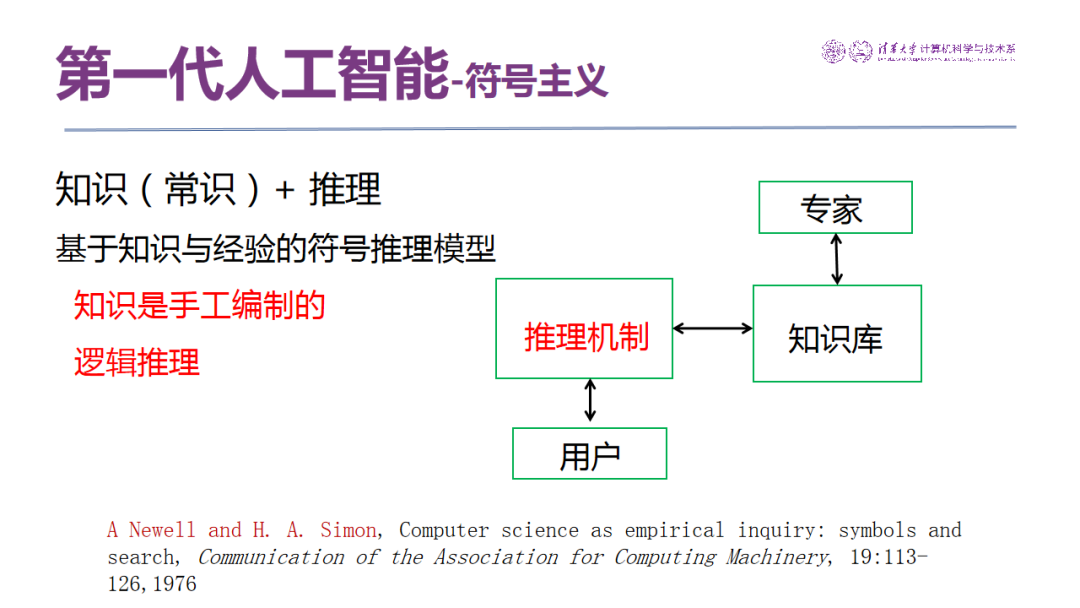 第一代人工智能就是大家所说的符号主义,实际上它是建立了一个知识和推理的模型,来模拟人类的理性的智能。在具体应用上,就是利用了知识和推理,构造化学结构分析系统、计算机硬件组合系统、血液传染病诊断处方等系统。
