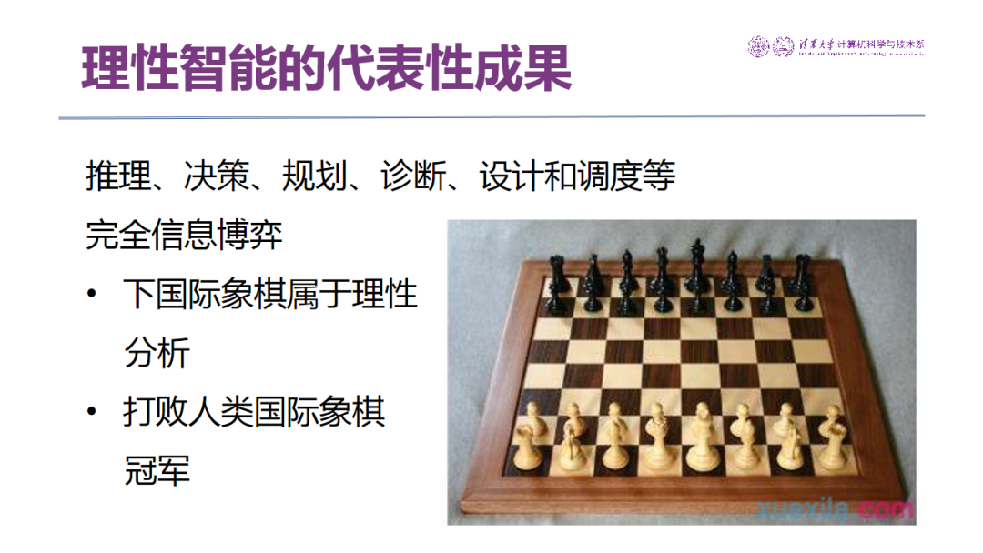 这种用知识和推理建立的模型,主要是用来模拟人类的理性智能,它的代表性成果是国际象棋。国际象棋是完全信息博弈,实际上与决策、规划、诊断、设计和调度等,都属于理性智能/理性分析。这个系统打败了人类国际象棋冠军卡斯帕诺夫,这就说明这样的系统在一定的条件下能够超过人类的水平。