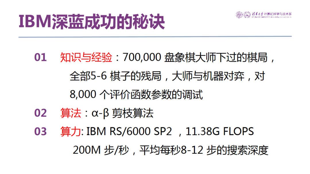 。以IBM深蓝为例,它分析了70万盘象棋大师下过的棋,还有全部5~6个棋子的残局。根据这些残局和大师下过的棋,总结出来下棋的规则。同时又通过大师和机器的对弈,对有8000个参数的评价函数进行调整,这样就可以把大师的经验也放到程序里。