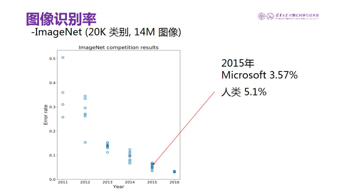 最后,深度学习第二代人工智能主要依靠三个要素:数据、算力,还有算法。使用深度学习以后可以解决很多实际问题,比如图像识别、语音识别的识别率有了大幅提升,2011年在IBM和微软在ImageNet上的图像误识率为50%,4年之后使用深度学习后误识率降到3.57%,实际上超过人类的水平。