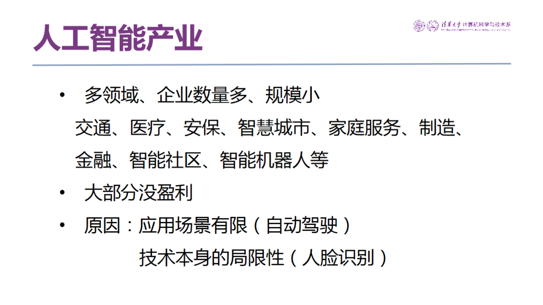 人工智能产业的第二个特点是大部分没有盈利。原因就在于第一代人工智能和第二代人工智能技术的局限性,主要表现在两个方面,一方面是现有技术的应用场景有限,只能应用到那些结构化、静态的环境中,比如把现有的第一代和第二代人工智能技术应用到自动驾驶场景中时,如果交通状况比较复杂,就很难应用。