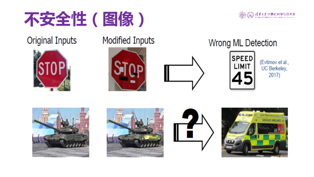 比如左边第一张图是一个停止的交通信号,我们只要在交通指示牌上加入一点噪声,图中是加上了几个白块和黑块,它却识别为限速45公里。再比如在图中最左边的坦克侧面涂上一些颜色,机器就将其误识别为校车。这说明,利用深度学习来构造的图像识别系统非常不安全,非常容易受攻击。