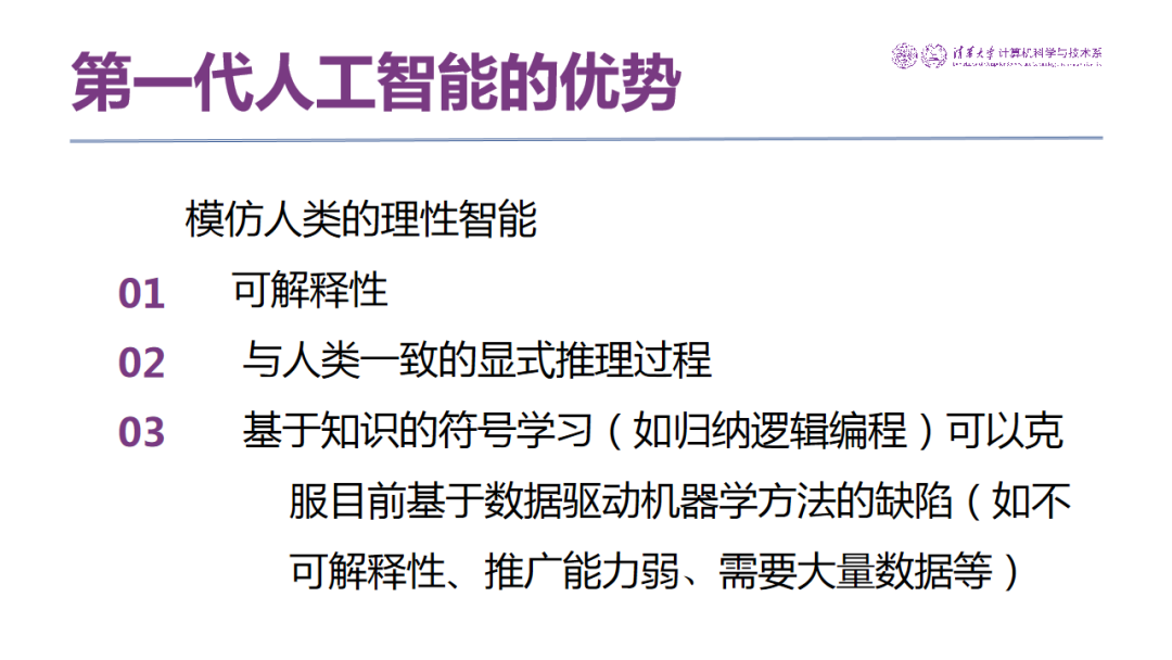 我们看一下第一代人工智能的优点。它可以模仿人类的理性智能。首先,它可以解释,可以和人类一样基于知识进行推理,我们不仅可以用来作为理性分析的模型,同时基于知识也可以用来进行机器学习。