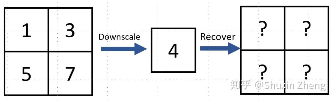 这个问题太难了,有太多种4个像素取值的组合都可以得到同样一张低分辨率图片。如果是4x降采样,则会有16个像素被采样成一个点。。想要精确地从一个像素还原出原图?你看看那些像素上的"?"眼熟不。。。