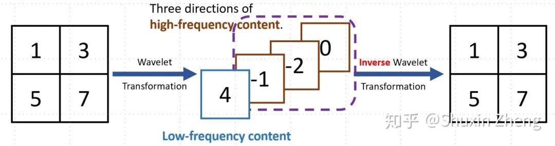 为了可以显式地保留高频信息,我们将降采样的过程替换为小波变换:由小波变换我们可以得到原图的一个低频分量和三个不同方向的高频分量。这里的低频分量与双线性插值降采样得到的低分辨率结果是一样的,而高频分量则是在降采样过程中被丢失的信息。