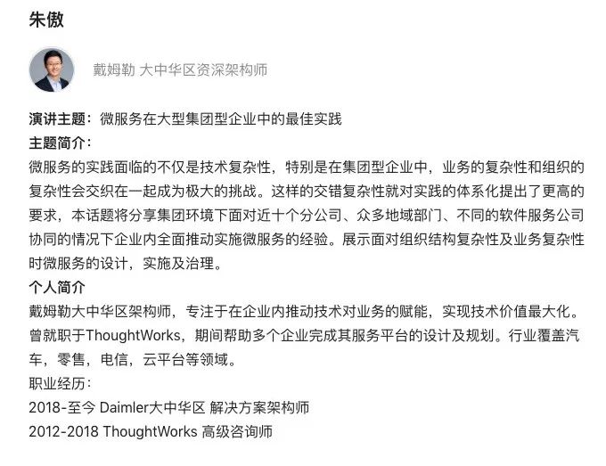 想了解更多微服务在大型集团型企业中的实践?11月1-2日,GOPS 2019 · 上海站,戴姆勒大中华区资深架构师朱慠与您面对面聊聊。
