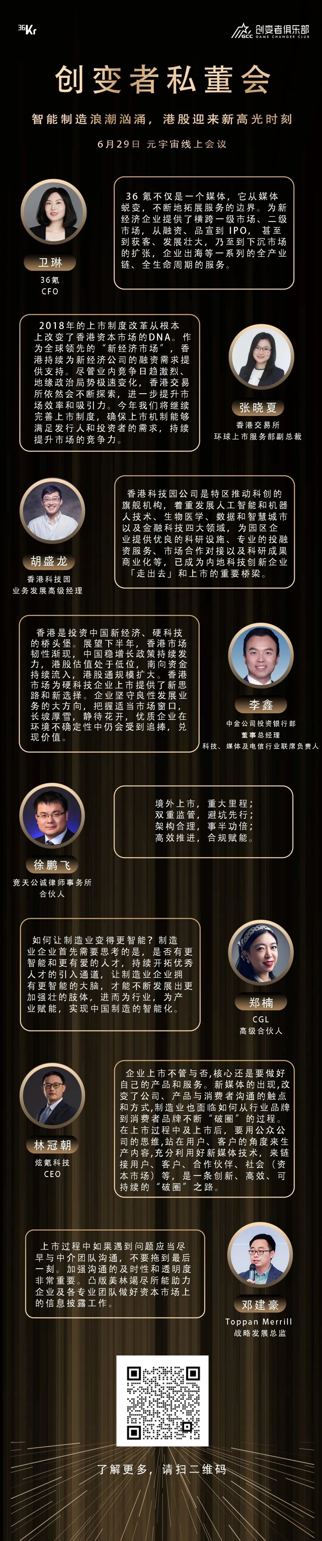 在这样的背景下,6月29日,36氪第五期创变者私董会聚焦“智能制造”主题,以元宇宙线上会议的形式对相关问题进行解答。会议邀请到了香港交易所环球上市服务部副总裁张晓夏,香港科技园业务发展高级经理胡盛龙,中金公司投资银行部董事总经理 科技、媒体及电信行业联席负责人李鑫,竞天公诚律师事务所合伙人徐鹏飞,CGL高级合伙人郑楠,炫氪科技CEO林冠朝,Toppan Merrill战略发展总监邓建豪进行分享与讨论。