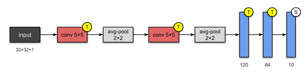 如下图所示为LeNet网络结构,总共有7层网络(不含输入层),2个卷积层、2个池化层、3个全连接层。