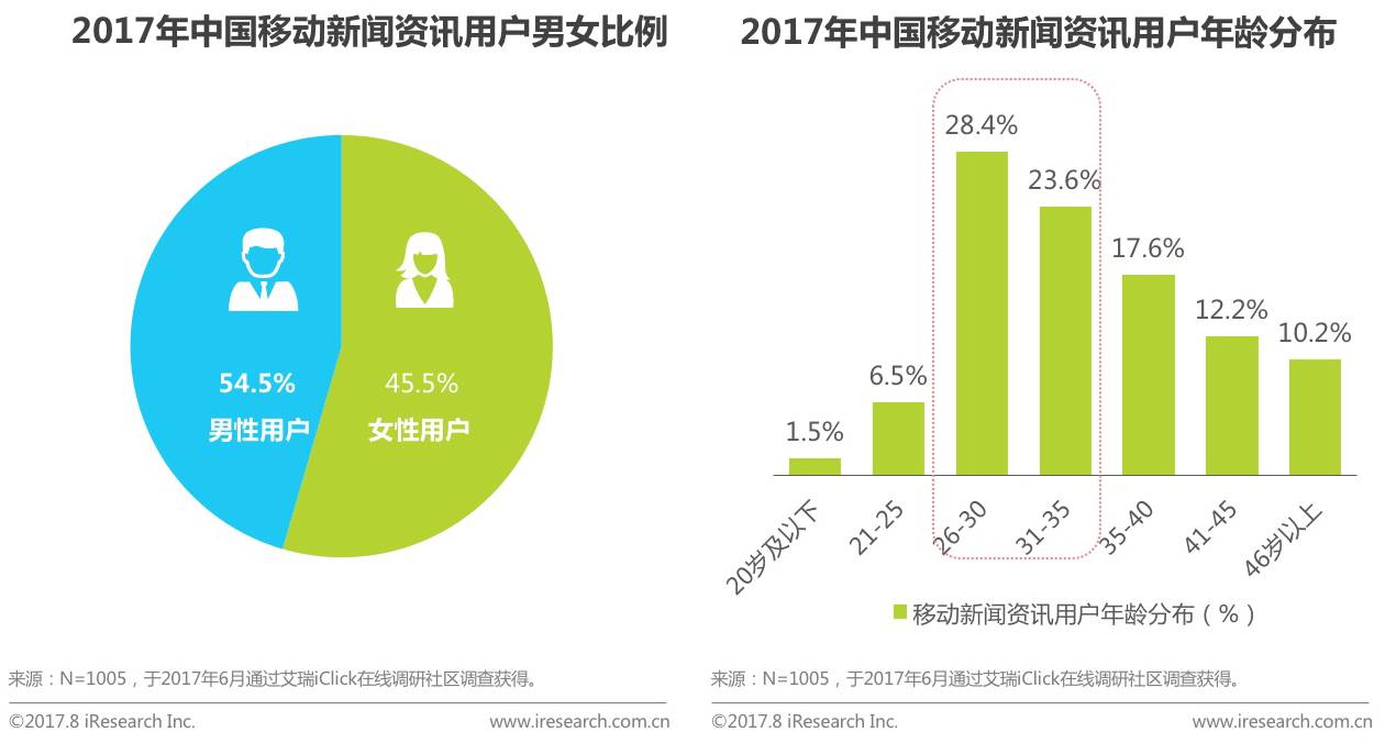 从年龄分布上来看,26岁到35岁为移动新闻资讯最主要的用户群,占比52.0%。另外,资讯类产品受众群年龄跨度较大,除25岁以下学生用户较少,其他年龄段用户分布较为平均。