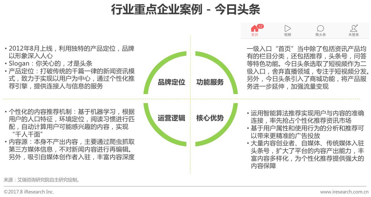 信息爆炸时代,用户筛选有价值信息的时间成本增高,算法推荐是解决这一痛点成本最低的解决方式。今日头条从诞生之初就自带了人工智能属性的标签,始终围绕着数据层、技术层和产品层不断迭代和升级。利用技术算法优势实现了资讯行业的弯道超车,将整个新闻资讯行业带入了个性化推荐时代。2016年底,今日头条完成了D轮10亿美元的融资,在注入新资本力量后,今日头条进一步扩大对于短视频、问答、新媒体等新型资讯内容的争夺,以加强平台内容的产出能力。今日头条的商业化路线也较为清晰,在原有的技术基础上,通过精准营销提高广告主的投放效率,将用户停留在今日头条上的时间最高效地转化成广告商业价值。