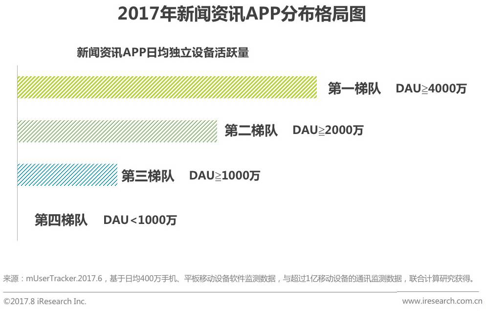 目前行业上的新闻资讯APP产品众多,但从流量上来看,梯队划分明显。第一梯队的DAU流量在4000万以上,且明显高于后续梯队的产品,但此梯队产品数量少(不超过5家),优势明显。第二梯队和第三梯队的产品差异化不高,竞争尤为激烈,DAU在1000万至3000万之间。绝大部分的新闻资讯产品排在第四梯队,日活跃设备数量在1000万以下。