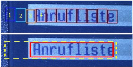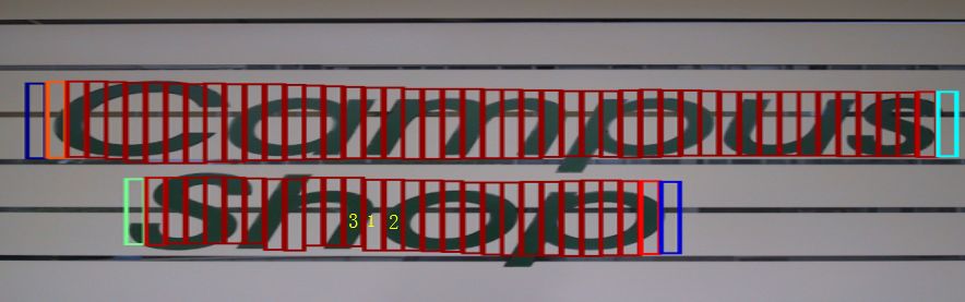 我们观察下图,第一幅图张我们看到我们有很多小候选框,位于左边的候选框我标记为1、2、3、4号框,1号框和2号框为蓝色,表明得分不高我们不把这两个框合并到大文本框内,对于3号框和4号框那就比较尴尬了,如果取3号框作为文本框的边缘框,那么显然左边边缘留白太多,精准度不够,但如果去掉3号框而使用4号框作为左边缘框,则有些字体区域没有检测出来,同样检测精度不足。