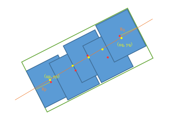 我画了下图辅助理解合并算法,橙色直线是拟合出的最佳直线,红色点表示segment的中心,黄点表示红点在直线上的投影,绿框就是合并后的完整本文框。