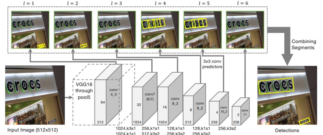 值得说明的是,conv4~conv11之间的尺寸依次减少(每一层是前一层的1/2)。这个做法是为了做多尺度下的目标检测,即大的feature map擅长做小物体的检测,而小的feature map则擅长检测大物体。借助多个不同尺度的feature map,从6个feature layer上检测segment和link,我们就可以检测出不同尺寸的文本行了。
