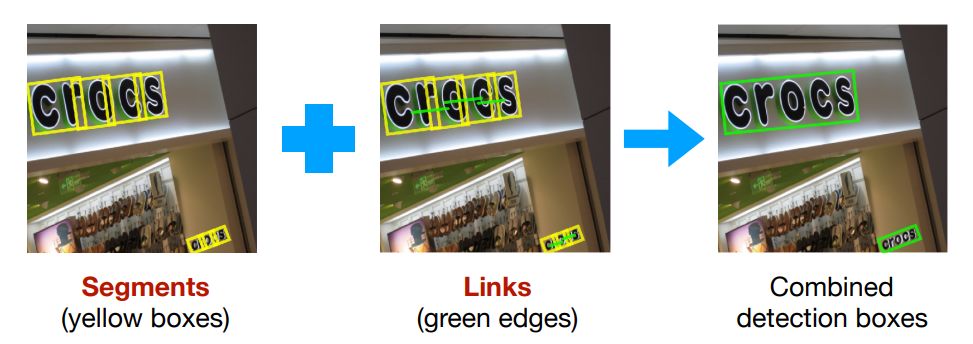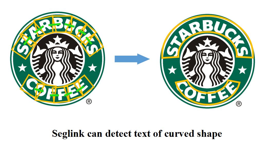 CVPR2017的一篇spotlight论文《Detecting Oriented Text in Natural Images by Linking Segments》介绍以一种可以检测任意角度文本的检测算法,我们一般称这个算法为SegLink,这篇论文既融入CTPN小尺度候选框的思路又加入了SSD算法的思路,达到了当时自然场景下文本检测state-of-art的效果。
