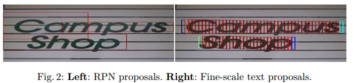 如图所示,左边的图是直接使用Faster RCNN中的RPN来进行候选框提取,可以看出,这种候选框太粗糙了,效果并不好。而右图是利用许多小候选框来合并成一个大文本预测框,可以看出这个算法的效果非常不错。