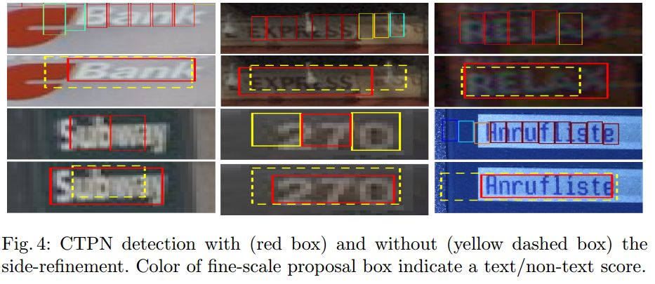 这种情况其实非常容易出现,所以CTPN采取了Side-refinement 思路进一步优化边缘位置的预测即引入回归X参数,X参数直接标定了完整文本框的左右边界,做到精确的边界预测。第二幅图中的红色框就是经过Side-refinement后的检测结果,可以看出检测准确率有了很大的提升。side-refinement确实可以进一步提升位置准确率,在SWT的Multi-Lingual datasets上产生2%的效果提升。