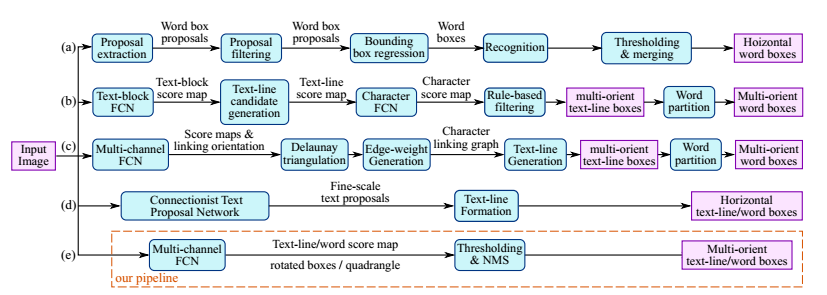 通过下图我们知道,一个文本检测有多个阶段,就以region proposals系的检测算法为例,他们通常包含候选框提取、候选框过滤、bouding box回归、候选框合并等阶段,EAST的作者认为,一个文本检测算法被拆分成多个阶段其实并没有太多好处,实现真正端到端的文本检测网络才是正确之举。所以EAST的pipeline相当优雅,只分为FCN生成文本行参数阶段和局部感知NMS阶段,网络的简洁是的检测的准确性和速度都有了进一步的提高。