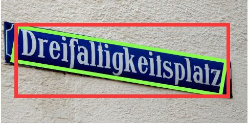 但是对于文本检测任务可不一样,文本的特点就是高宽比特别大或小,而且文本通常存在一定的旋转角度,如果我们对于带角度的文本仍然使用目标检测那个思路回归四个参数(x,y,w,h)来指定一个目标的位置的话(如下图红色框),那显然误差太大了,这个检测效果并不是我们所能接受的。作为对比,下图的绿色框的检测效果才是我们的终极目标。那么怎么基于原来经典的目标检测算法做相应的优化以适应这种检测效果的要求呢?