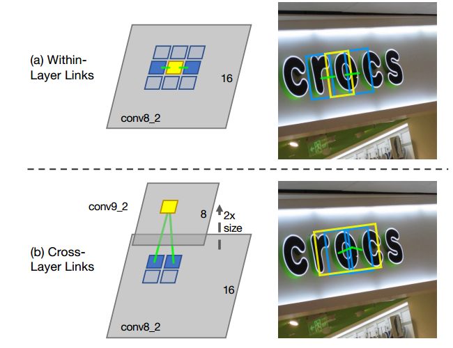 cross-layer link:在不同的feature layer上有可能会检测到同一文本的segments,造成冗余,cross-layer link的提出就是为了解决这个问题。cross-layer link连接了两个相邻feature layer上的segments,如图(b)所示。需要注意的是,由于下采样使后一层为前一层scale的1/2,定义一个segment的cross-layer邻居为前一层4邻域更小的segment,即前一层是后一层的邻居,但后一层不是前一层的邻居,所以conv4_3的feature layer没有cross-layer邻居。图中所示的黄框为当前层的segment,蓝框为上一层更小更细的segment,绿色的线代表cross-layer link有连接,属于同一文本,在后续的combine算法中会将他们融合,即去除了冗余。