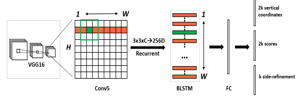 当然CTPN中还是保留了RPN大多数的思路,比如还是需要预测候选框的分数score(该候选框有文本和无文本的得分)。