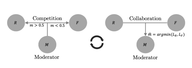 如图2所示,我们将训练分为两个阶段,第一阶段固定调节者M,最小化式1(竞争阶段),第二阶段竞争对手{R,F}形成共识训练调节者M,使其能正确的分割静态场景与运动物体,最小化式2(合作阶段)