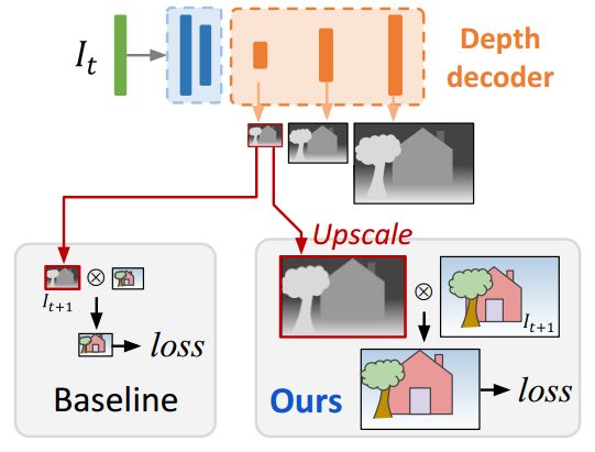 如下图3所示,本文将不同尺度的depthmap进行上采样至输入图像的分辨率,然后再计算光学误差。该方法可以有效的约束每个尺度的深度图都朝着重建高分辨率的目标图像这个目标。