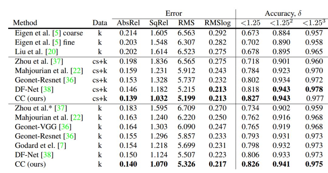 4.实现了无监督学习单一视角深度估计和相机位姿估计的SOTA,实现了无监督学习关于场景几何光流的SOTA,引入了无监督学习运动分割的baseline。