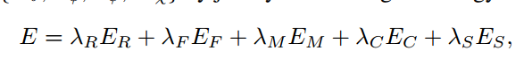 如公式3所示,损失函数由5项组成,其中ER为利用深度和相机位姿计算的光学重建误差,EF为利用光流计算的光学重建误差,EM为标签始终为1的交叉熵,EC为深度估计和光流估计之间达成共识来约束掩膜分割对象的损失函数,ES为局部光滑损失。