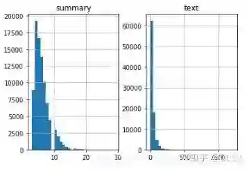 通过数据统计,可以看到摘要与文本数据的长度分布。通过数据可视化,我们可以将评论文本的长度限定在80,而摘要的长度限定在10。