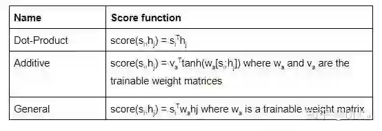 根据所使用的得分函数的类型,有不同类型的注意力机制。这里列举一些流行的注意力机制: