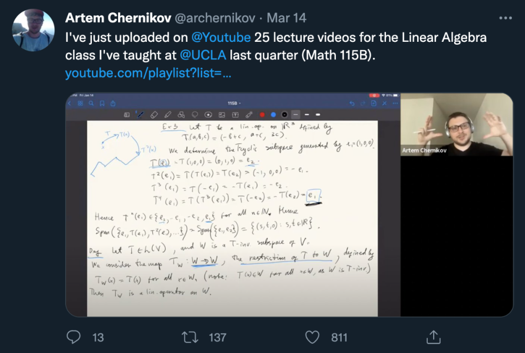 近日,UCLA 教授 Artem Chernikov 宣布自己的线性代数课程 UCLA MATH 115B 全部内容已在 YouTube 平台公开。