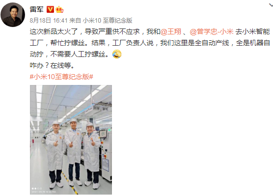 小米10周年演讲前夕雷军前往小米智能工厂