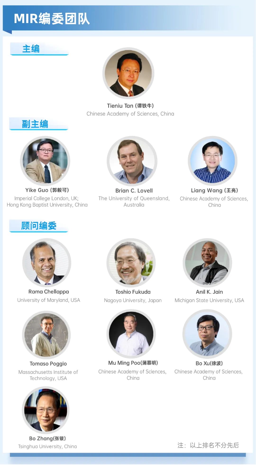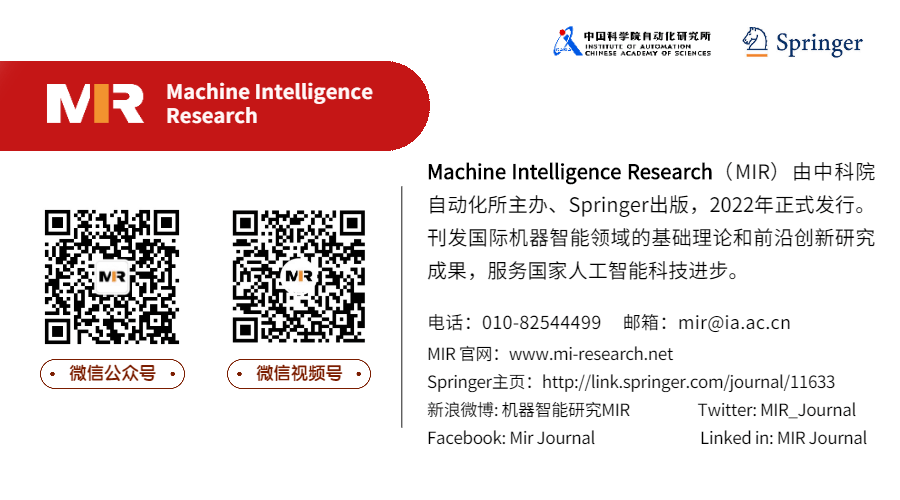 Machine Intelligence Research(简称MIR,原刊名International Journal of Automation and Computing)由中国科学院自动化研究所主办、Springer海外出版,于2022年正式出版,主编为中科院自动化所谭铁牛院士,帝国理工学院郭毅可教授、澳大利亚昆士兰大学Brian C. Lovell教授、中科院自动化所王亮研究员担任期刊副主编。