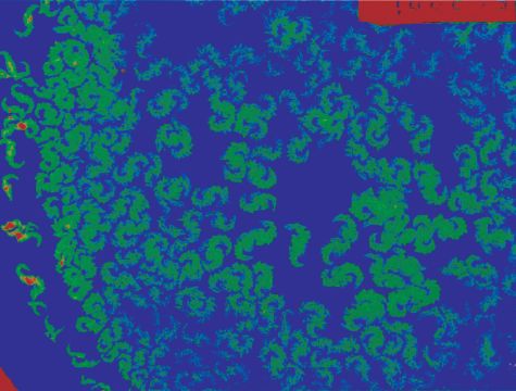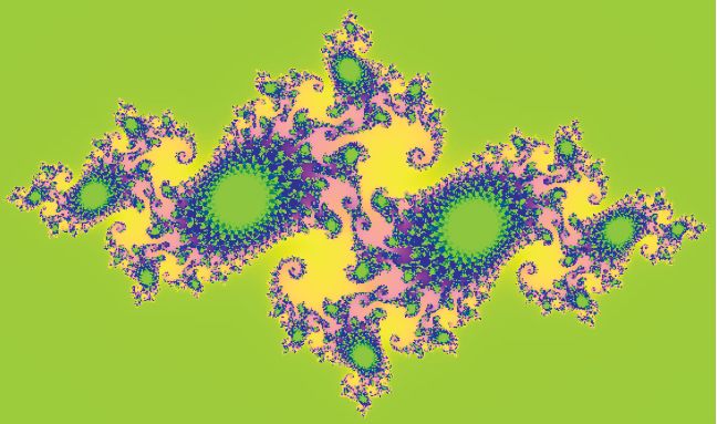 确定“海马”图形的基本形成机制是极富挑战性的,这一图案与一种特殊的结构相类似,这源于Julia对复杂空间中函数的纯粹数学映射:z→z2+c,其中c=-0.74543+0.1130i. 在复平面中,水平坐标代表实数,垂直坐标代表虚数. 每个Julia集合(有无限多个点)都决定一个常数c,它是一个复数. 在复平面上任意取一个点,其值是复数z. 将其代入方程z→z2+c,进行反复迭代运算,即用旧的z 自乘再加上c 后的结果作为新的z;再把新的z 作为旧的z,重复运算,就得到了令人难以置信的图案,图8是我们运用上述公式模拟得到的图形,这是数学上的一种类似我们前面得到的“海马”类的分形.