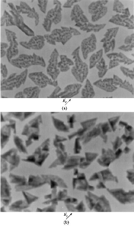 带电+中性粒子模型的合理性被以下事实支持:在ICB 方法中,沉积到基底上的粒子大部分是中性的,其中小部分是带电的. 若静电荷在生长中起重要作用,那么在沉积过程中,在基底上加静电场可能对生长产生影响. 相关的实验是加一个与基底平行的电场E〃,在其他生长条件不变的情况下,得到的结果见图7. 我们在图8(a)和(b)中均发现了不规则的直的形态,它的主轴与外加电场呈一个角度.