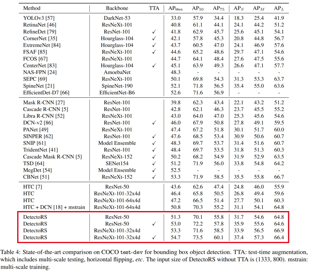 在COCO test-dev 目标检测中,DetectoRS在使用ResNet-50和ResNeXt-101-32x4d作为主干网络时达到54.7% AP,超越了其他的算法。