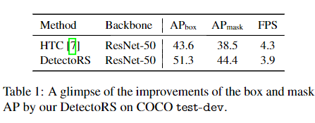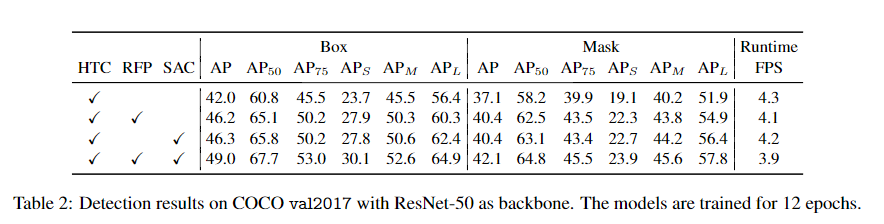 训练数据集作者采用的COCO数据集。作者使用mmdetection 实现了Detec-toRS。baseline模型是HTC ,在单个NVIDIA TITAN RTX显卡上测试。为了方便对比,整体的实验配置和HTC网络保持一致。