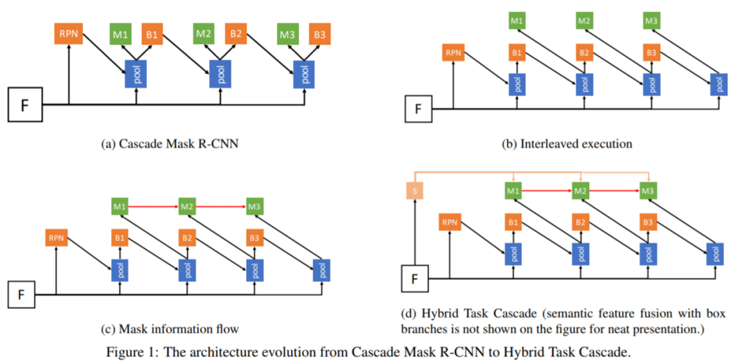 HTC是一种多任务多阶段的混合级联结构,融合了一个语义分割的分支来增强 spatial context。整个框架的演进可以用上面的四张图来表示,其中 M 表示 mask 分支,B 表示 box 分支,数字表示 stage,M1 即为第一个 stage 的 mask 分支。HTC这种框架取得了明显优于 Mask R-CNN 和 Cascade Mask R-CNN 的结果。